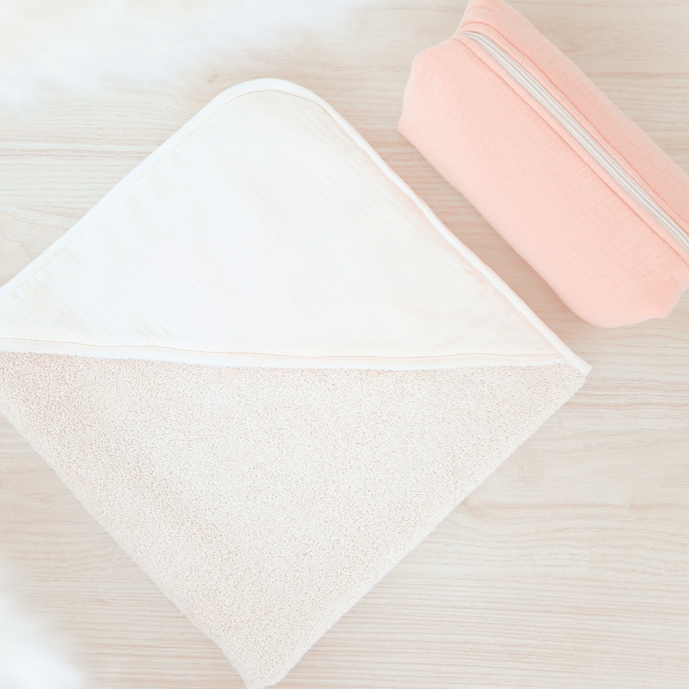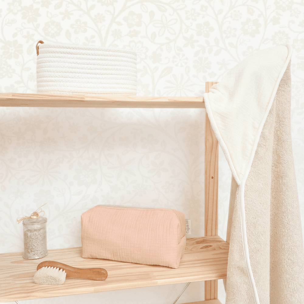 ✅ Une trousse de toilette matelassée en double gaze de coton bio : Un accessoire pratique et élégant pour ranger les indispensables de bébé.